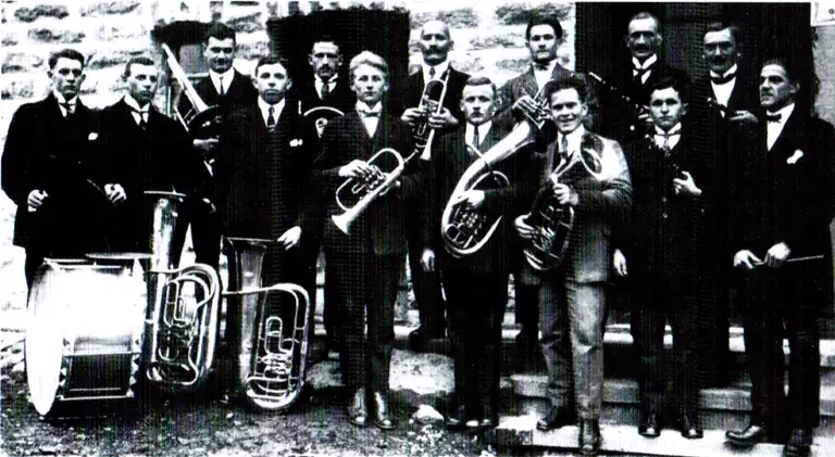 Die Musiker von links: Alois Burkard, Eugen Mink, Gottfried Heimburger, Anton Mink, Viktor Albrecht, Meinrad Burkard, Konstantin Dilger, Johann Merkle, Bernhard Bauer, Martin Graf, Hermenegild Hall, Josef Merkle, Heinrich Schmieder, Kapellmeister Christian Schlenker.